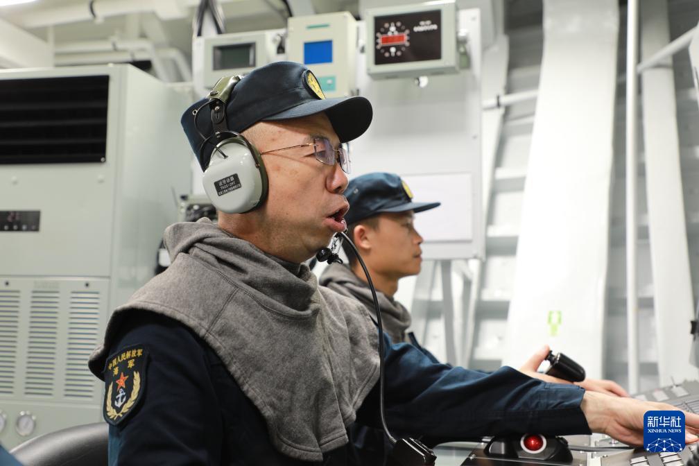 海軍資陽艦主炮區(qū)隊(duì)長馬少利(左)帶領(lǐng)戰(zhàn)友開展戰(zhàn)位操演(6月13日攝)。新華社記者 李秉宣 攝