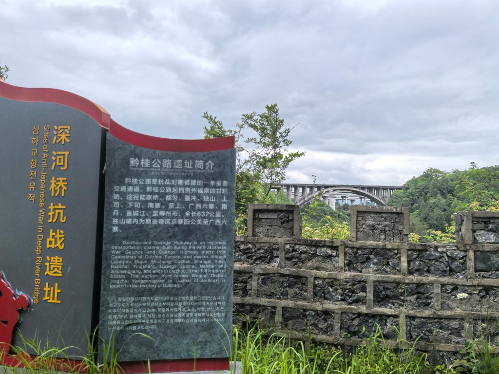 如今,被炸斷的深河橋橋墩掩映在樹林間,默默訴說著歷史;一旁重建的深河橋,已是210國(guó)道上的重要橋梁。站在深河橋抗戰(zhàn)遺址上遠(yuǎn)眺,G75蘭海高速上的深河大橋與獨(dú)山前往都勻的都獨(dú)同城大道凌空飛架,橫亙?cè)谇嗌骄G水間……交通設(shè)施的滄桑巨變,見證著獨(dú)山人民奔向幸福生活。