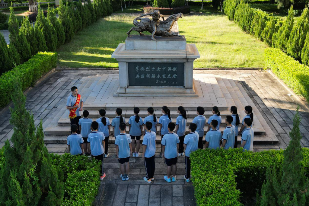 ↑福建省廈門集美中學(xué)李林園內(nèi),講解員為同學(xué)們介紹李林的事跡。(無人機(jī)照片)鐘煒俊攝