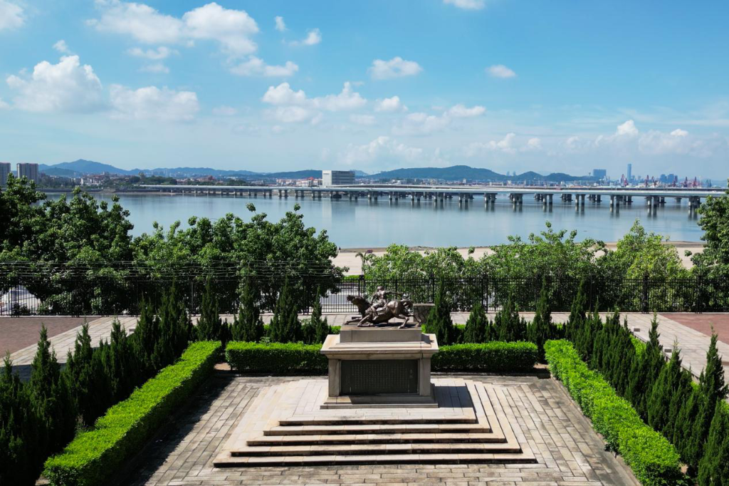 ↑福建省廈門集美中學(xué)李林園內(nèi),面海而立的李林雕像。(無人機(jī)照片)鐘煒俊攝