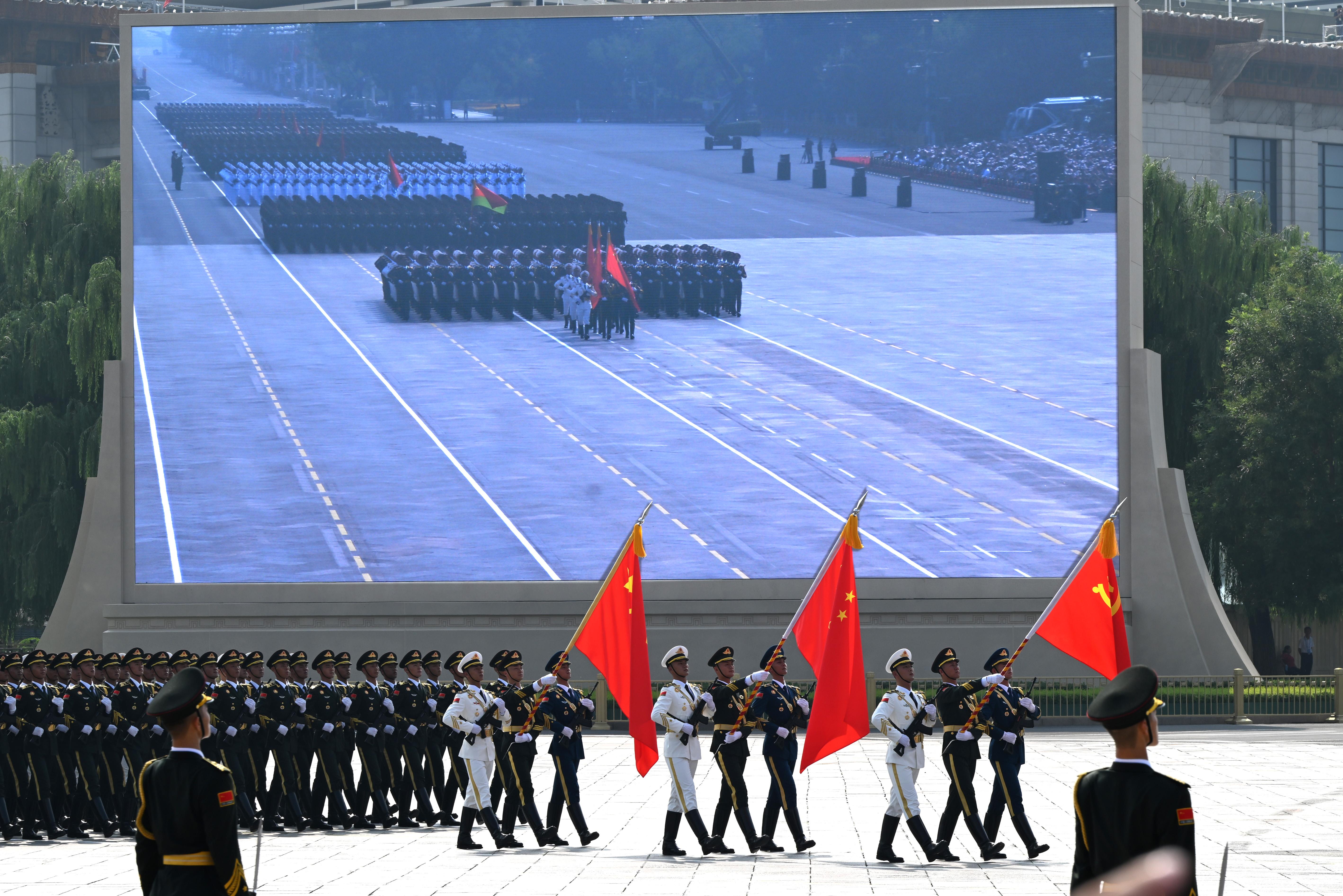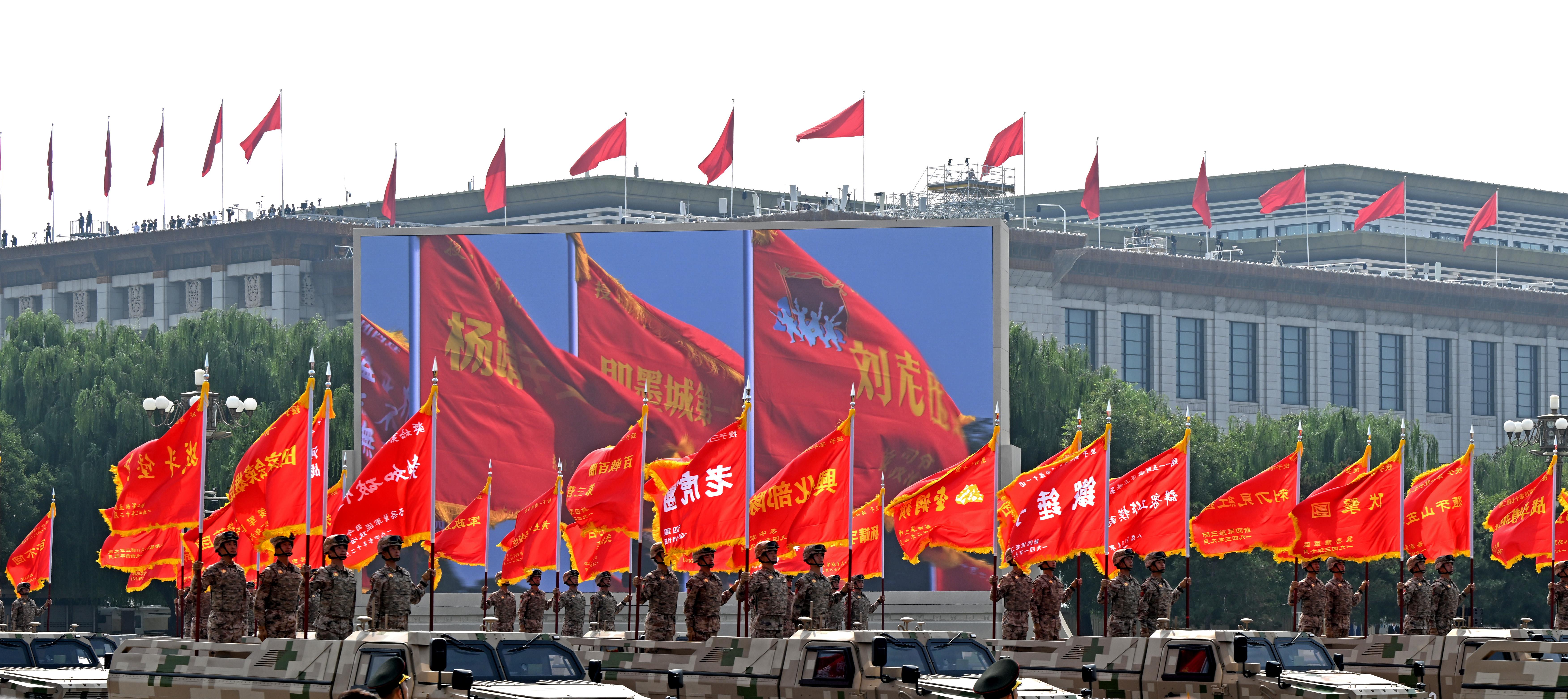 由80面抗戰(zhàn)英模部隊榮譽(yù)旗幟組成的戰(zhàn)旗方隊接受檢閱。