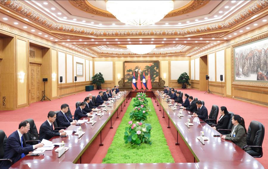 9月4日上午,中共中央總書記、國家主席習(xí)近平在北京人民大會堂會見來華出席2025年上海合作組織峰會和紀念中國人民抗日戰(zhàn)爭暨世界反法西斯戰(zhàn)爭勝利80周年活動并進行工作訪問的老撾人民革命黨中央總書記、國家主席通倫。新華社記者 黃敬文 攝
