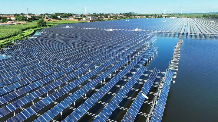 2025年7月30日在遼寧省鐵嶺市鐵嶺縣大青水庫拍攝的光伏發(fā)電板(無人機照片)。新華社記者 楊青 攝