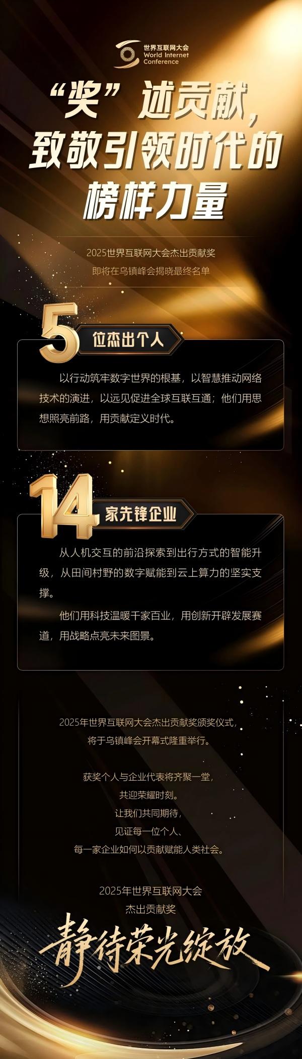 世界互聯(lián)網(wǎng)大會(huì)自2024年起設(shè)立世界互聯(lián)網(wǎng)大會(huì)杰出貢獻(xiàn)獎(jiǎng),表彰在全球互聯(lián)網(wǎng)相關(guān)領(lǐng)域作出杰出貢獻(xiàn)的個(gè)人和企業(yè)。獎(jiǎng)項(xiàng)旨在發(fā)揮榜樣模范的引領(lǐng)作用,激勵(lì)各方不斷推動(dòng)互聯(lián)網(wǎng)及相關(guān)領(lǐng)域蓬勃發(fā)展,讓更多國家和人民共享互聯(lián)網(wǎng)發(fā)展成果。