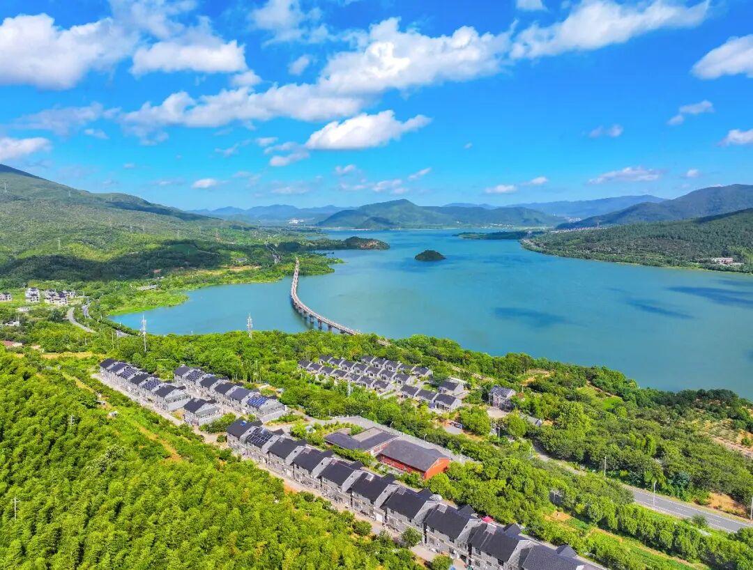 浙江省湖州市長(zhǎng)興縣小浦鎮(zhèn)合溪村,水庫(kù)與青山、村莊、道路相映成景,構(gòu)成一幅風(fēng)光旖旎、生態(tài)秀美的綠水青山壯麗畫(huà)卷。陳海偉 攝