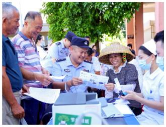 近日,海南省公安廳反走私和海岸管理總隊、總隊第一支隊聯(lián)合省老年病醫(yī)院在??谑醒葚S鎮(zhèn)演海村開展“健康惠民義診+反走私普法宣傳”警醫(yī)共建活動。圖為民警向村民發(fā)放反走私宣傳材料。(本報通訊員 代龍超 攝)