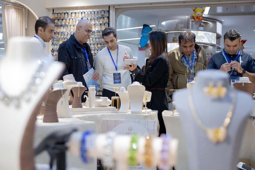 2025年10月27日,外國商人在浙江義烏第六代市場全球數(shù)貿(mào)中心進(jìn)行采購洽談。(吳峰宇 攝)