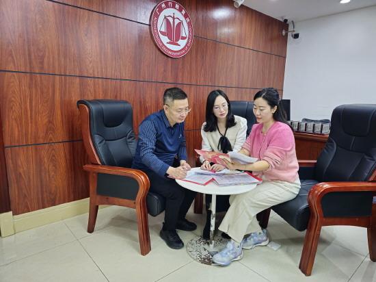 圖為周秋妤(右一)和同事一起對(duì)疑難復(fù)雜案件進(jìn)行合議,研究實(shí)質(zhì)化解行政爭(zhēng)議路徑。廣州市司法局供圖