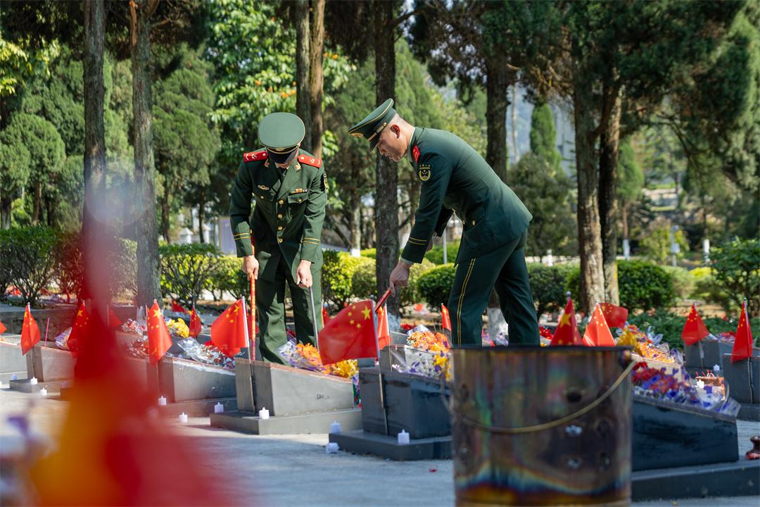 宣誓結(jié)束后,官兵們細(xì)心擦拭每一塊烈士墓碑,清理周邊雜物雜草。隨后,大家依次緩步上前獻(xiàn)花,寄托對(duì)革命先烈的無限哀思與崇高敬意。