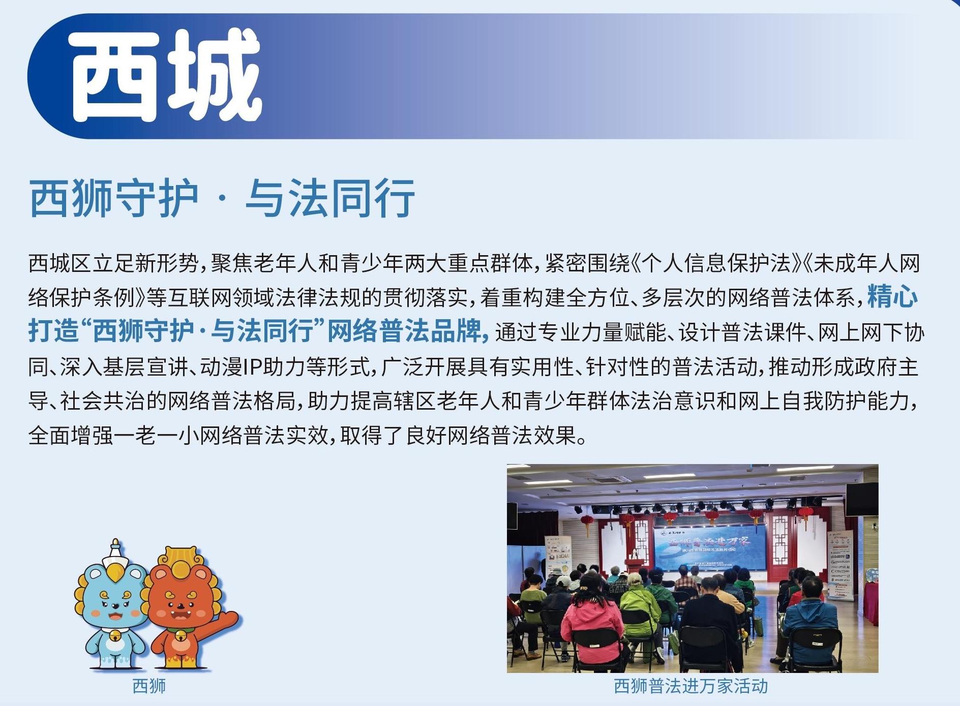 西城區(qū)立足新形勢,聚焦老年人和青少年兩大重點群體,緊密圍繞《個人信息保護法》未成年人網(wǎng)絡保護條例》等互聯(lián)網(wǎng)領域法律法規(guī)的貫徹落實,著重構建全方位、多層次的網(wǎng)絡普法體系,精心打造“西獅守護·與法同行”網(wǎng)絡普法品牌。[詳細]