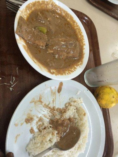 下面兩張是我中午在公司食堂吃的工作餐,算是典型的當?shù)夭?,前者是我的習慣,后者澆上醬汁是當?shù)厝说牧晳T。