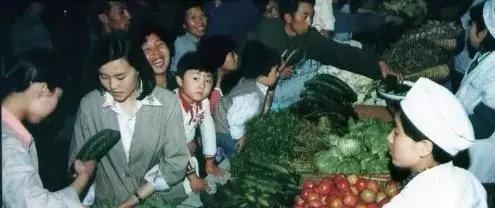這張照片像是在秋季拍攝,也有擺拍“嫌疑”。因為在那個年代平時副食品商場的蔬菜柜臺品種絕沒有這么豐滿齊全。照片上的很多顧客對拍攝者都投來了關(guān)注的目光。