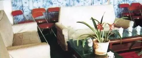 這里應(yīng)該是這家旅社的一個會議室。那個年代的沙發(fā)、金屬折疊椅,傳統(tǒng)的茶幾上的水杯煙灰缸,還有君子蘭的花盆。充滿著那個年代會議室的特色。