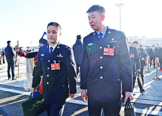 圖① 3月9日,十四屆全國人大四次會議第二次全體會議在北京人民大會堂舉行。圖為兩位公安代表步入會場。 本報記者 范瑞恒 攝
