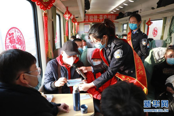 1月25日,包頭鐵路公安處民警在列車上給旅客發(fā)放印有疫情防控宣傳標語的“安全口罩”。新華社發(fā)