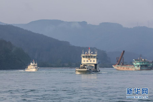 2月23日,第102次中老緬泰湄公河聯(lián)合巡邏執(zhí)法編隊啟航,中方執(zhí)法艇編隊巡航經過瀾滄江景哈水域。 新華社發(fā)(張壽晨 攝)