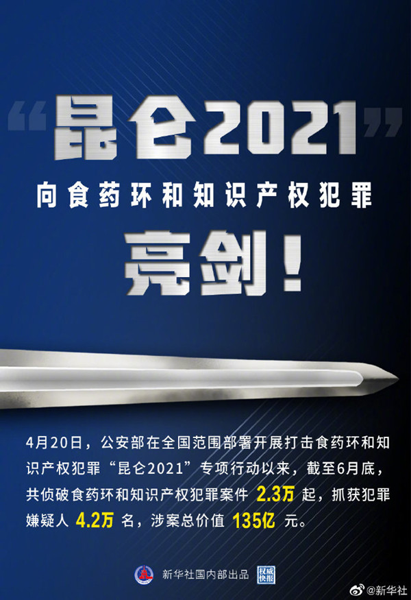 呵護(hù)“舌尖上的安全”、保障醫(yī)療用藥安全、打擊侵權(quán)假冒犯罪、打擊破壞生態(tài)環(huán)境犯罪……公安部29日召開新聞發(fā)布會(huì)介紹,公安部4月20日在全國范圍部署開展打擊食藥環(huán)和知識(shí)產(chǎn)權(quán)犯罪“昆侖2021”專項(xiàng)行動(dòng)以來,截至6月底,共偵破食藥環(huán)和知識(shí)產(chǎn)權(quán)犯罪案件2.3萬起,抓獲犯罪嫌疑人4.2萬名,涉案總價(jià)值135億元。(記者熊豐,海報(bào)設(shè)計(jì)賈伊寧)