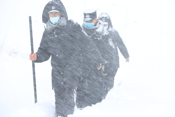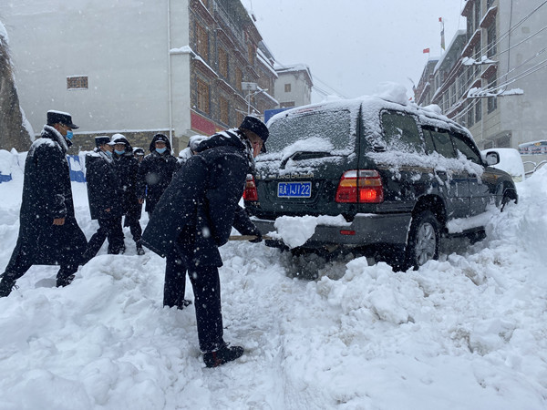 “這是我看到過(guò)最厚的一場(chǎng)雪,我們必須要以風(fēng)雪為令,以雪情為警情,守護(hù)好邊境群眾的生命財(cái)產(chǎn)安全。”移民管理警察拉加?xùn)|主說(shuō):“后面同志走快點(diǎn),前面有受困車輛需要幫忙,我們集體上前搭把手”。