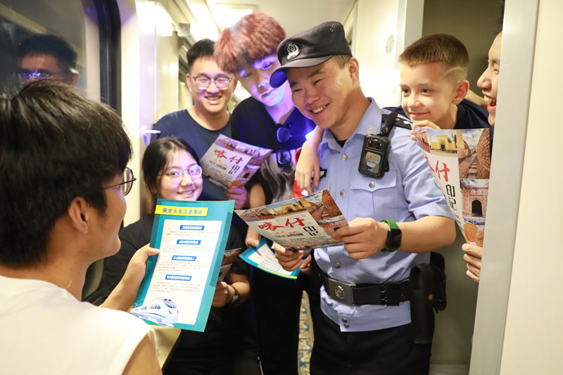 隨著暑期“新疆游”持續(xù)升溫,烏魯木齊鐵路公安局庫爾勒公安處乘警支隊(duì)以夏季治安打擊整治行動為契機(jī),開展打造平安列車專項(xiàng)行動,全力確保旅客平安出行。圖為7月30日,乘警在旅游專列上向游客宣講乘車安全常識并介紹新疆旅游資源及風(fēng)土人情。
