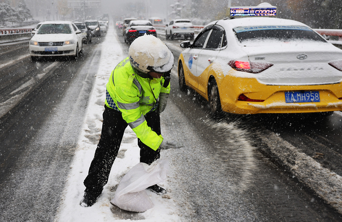 11月6日,遼寧省沈陽市出現(xiàn)雨雪天氣,沈陽市公安交警啟動惡劣天氣預(yù)案,對轄區(qū)內(nèi)結(jié)冰、積雪路段重點布置警力,確保市民出行安全。圖為沈河交警大隊民警在坡路撒融雪劑。