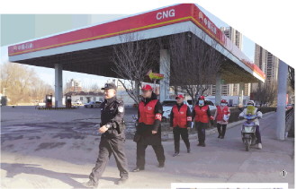 圖① 孔笛帶領(lǐng)平安志愿者在轄區(qū)巡邏。