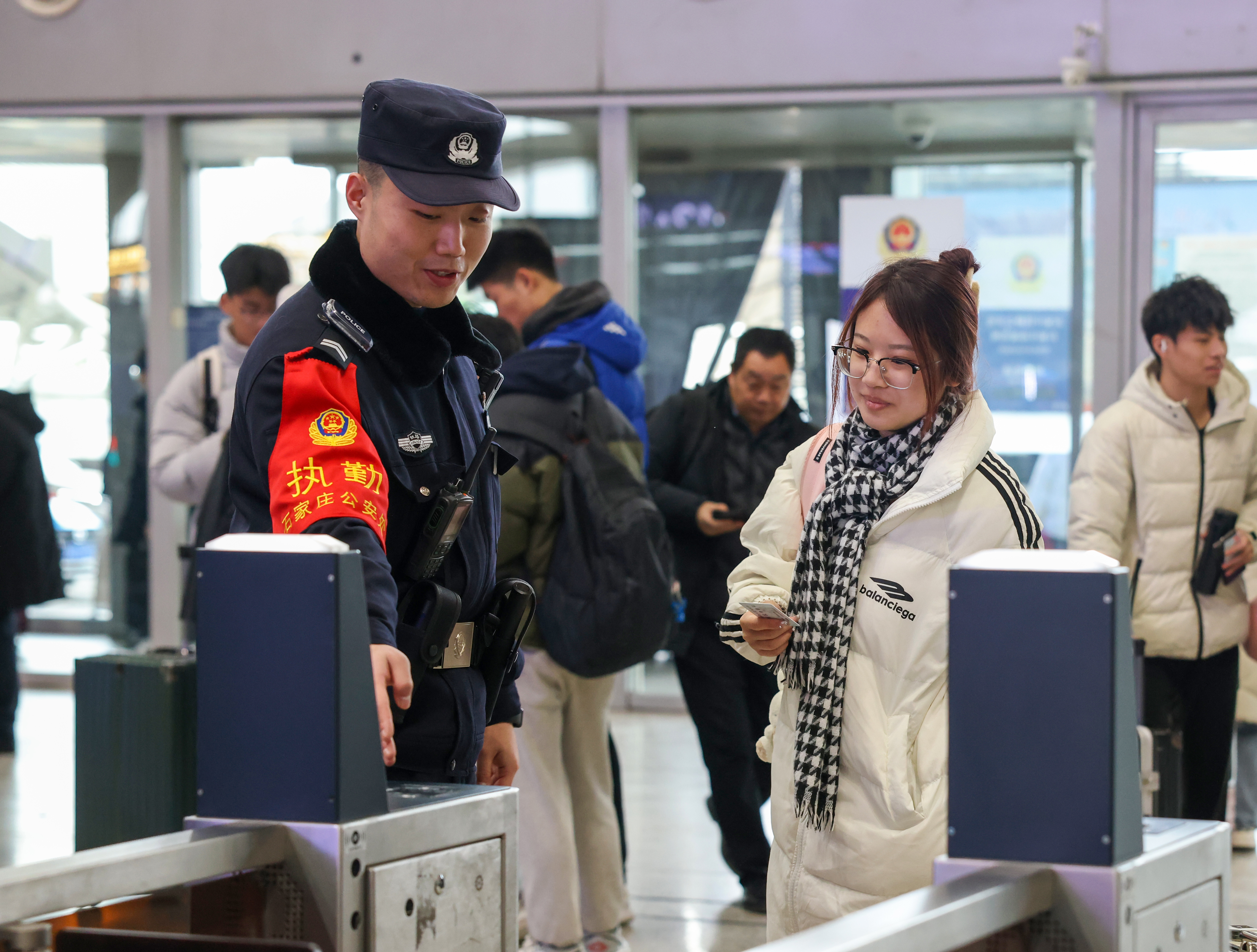 隨著高校寒假開(kāi)啟,大學(xué)生客流持續(xù)攀升,北京鐵路公安局石家莊公安處石家莊站派出所近日深入開(kāi)展暖心護(hù)航行動(dòng),開(kāi)通綠色通道,全力保障學(xué)生旅客平安出行。圖為民警指引大學(xué)生旅客使用自動(dòng)閘機(jī)進(jìn)站乘車。