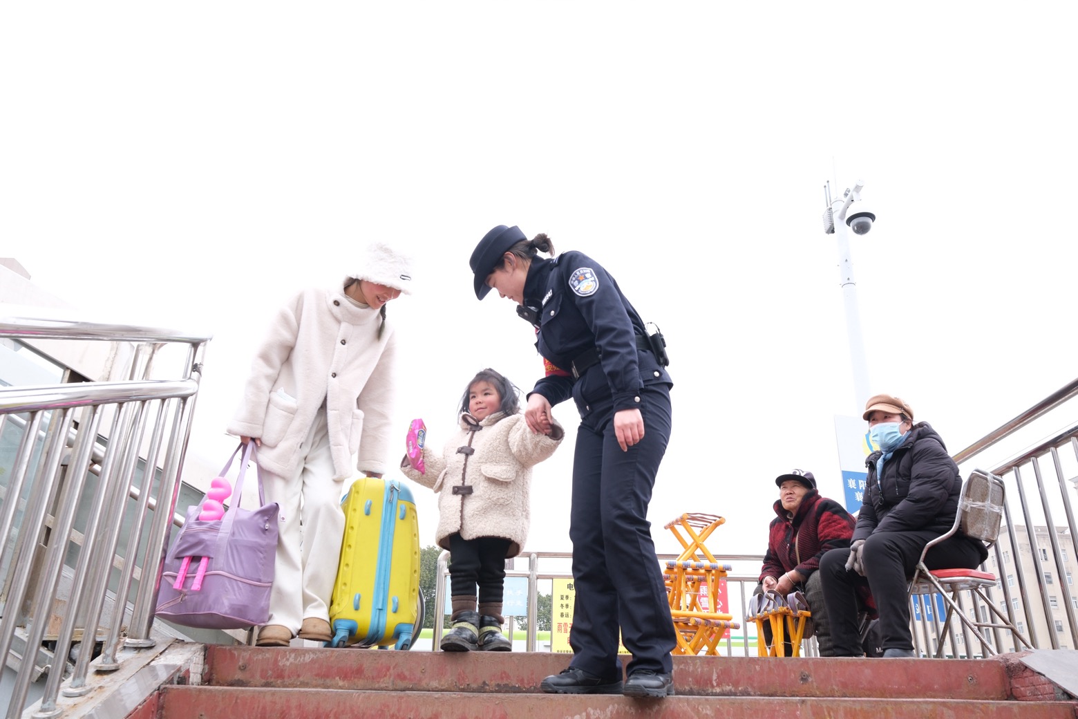近日,湖北省普降大雪。為確保廣大旅客安全出行,襄陽鐵路公安處乘警支隊(duì)與襄陽車站派出所積極做好車站及列車秩序維護(hù)工作,保障旅客生命及財(cái)產(chǎn)安全。圖為2月26日,民警幫助一位帶小孩的女士進(jìn)站乘車。