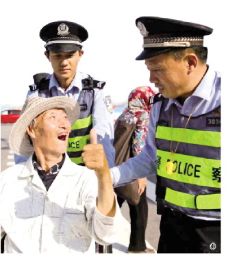圖① 李華瑞(右)在巡邏途中遇到一名殘疾老人,主動為其推輪椅,并囑咐他注意安全。