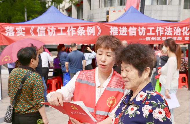 近日,江西省上饒市信州區(qū)委信訪局聯(lián)合市公安局信州分局、東市街道開展《信訪工作條例》宣傳活動。圖為工作人員向群眾發(fā)放宣傳手冊、答疑解惑。