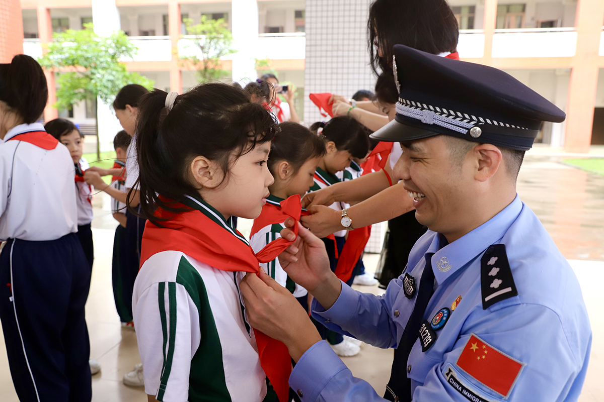 珠海邊檢總站開平邊檢站移民管理警察為學(xué)生佩戴紅領(lǐng)巾