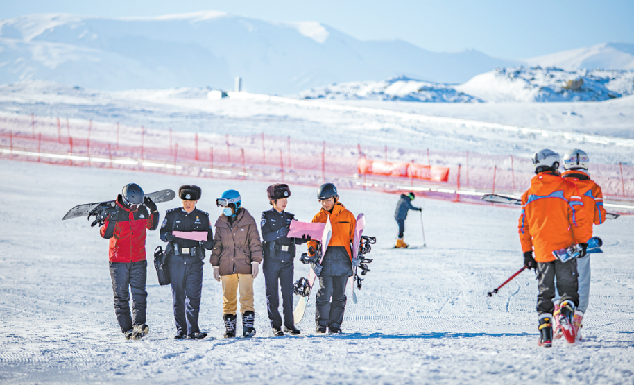 近日,新疆博州邊境管理支隊扎勒木特邊境派出所對轄區(qū)滑雪場開展安全檢查,開展應(yīng)急救援演練、雪具用品抽查等工作,及時排查各類安全隱患。圖為民警向游客開展滑雪安全宣傳教育。