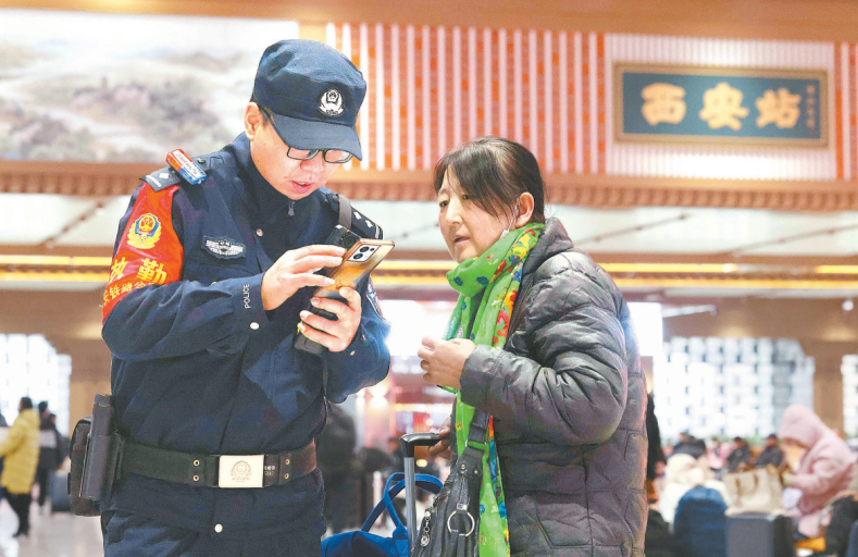 1月1日,西安鐵路公安局西安公安處民警堅(jiān)守崗位,護(hù)航旅客平安出行。圖為民警在西安火車站候車室?guī)椭每徒鉀Q問(wèn)題。