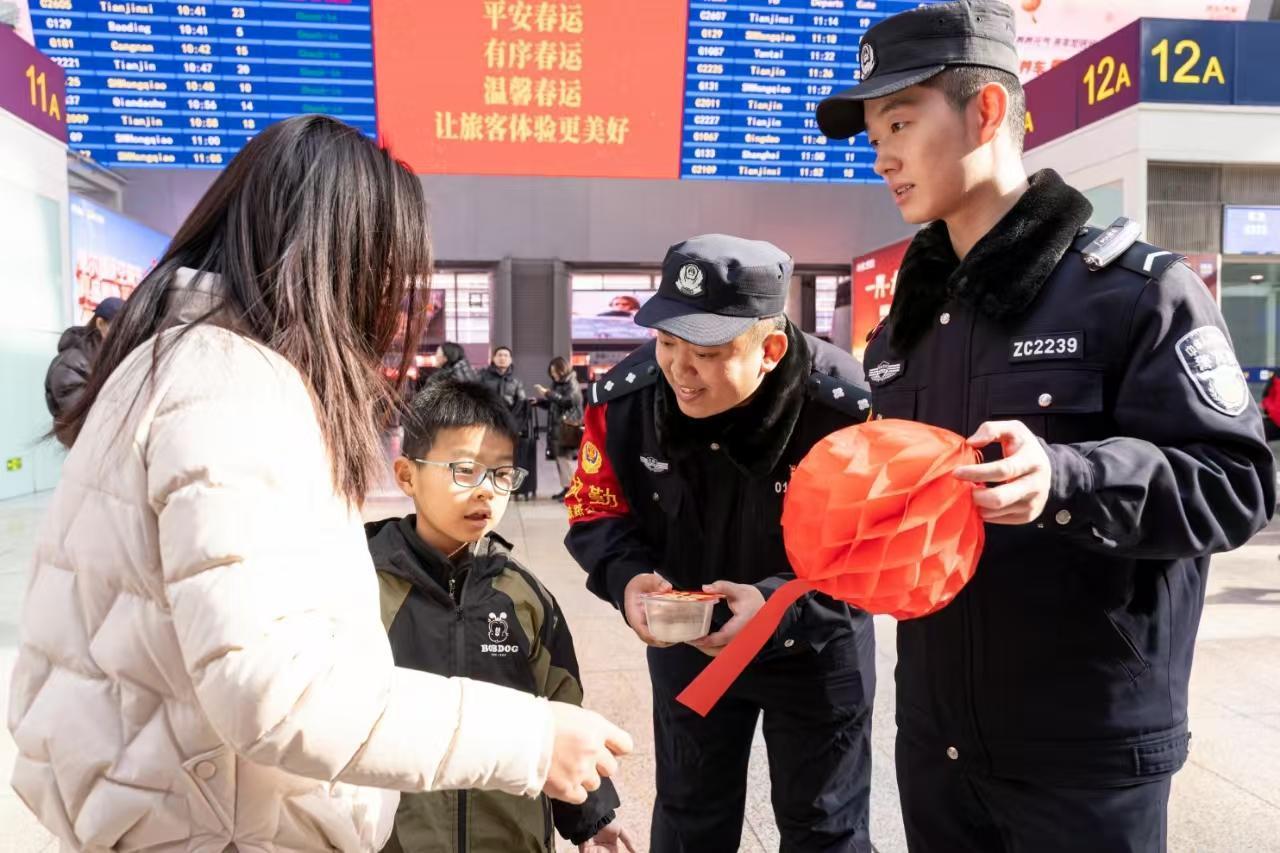 2月12日是農歷元宵佳節(jié),北京鐵路公安處北京南站派出所民警走到旅客中間,開展安全出行猜燈謎活動。據(jù)悉,鐵路民警制作的燈謎謎面涵蓋反詐宣傳、乘車安全、平安出行常識等內容,并結合春運出行,提醒旅客旅途中提高安全防范意識。圖為民警邀請旅客猜燈謎并送上可口的元宵。