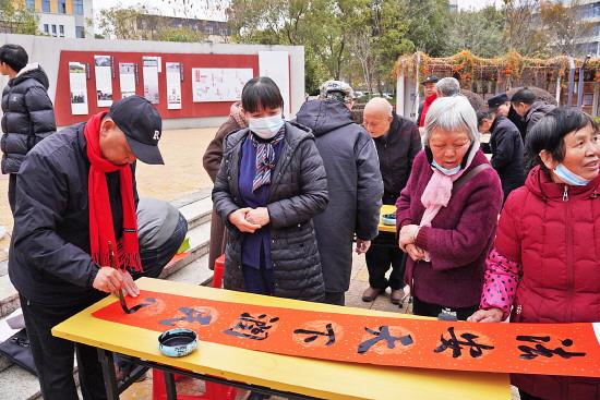 原來(lái),當(dāng)天是三二五村的“新春送對(duì)聯(lián)”活動(dòng)日。8時(shí)30分,村頭紅色文化廣場(chǎng)上已聚了不少人,書(shū)法家揮毫題聯(lián),觀眾喝彩聲不斷。匆匆趕來(lái)的黎伯忙前忙后,幫村里人布好紅紙,又用帶來(lái)的青磚壓住未干的春聯(lián)防止被風(fēng)吹跑。