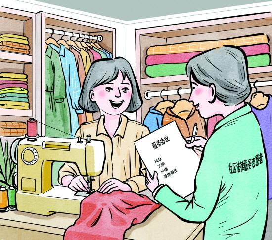 北京市豐臺(tái)區(qū)的陳女士曾在服裝廠做流水線車工,每天不僅工作辛苦,還有嚴(yán)格的上下班考勤,后來工廠搬遷到外地,她不愿背井離鄉(xiāng),便在家附近的小區(qū)一樓租了一間空房,于去年三月開了一家依靠老顧客介紹的手工改衣店。開店后,社區(qū)法律服務(wù)志愿者為她定制相關(guān)服務(wù)協(xié)議,寫明項(xiàng)目、工期、價(jià)格、返修責(zé)任,避免了可能發(fā)生的糾紛。在社區(qū)做了登記備案后,居民更信任,改衣店的客源也比之前多了一倍。