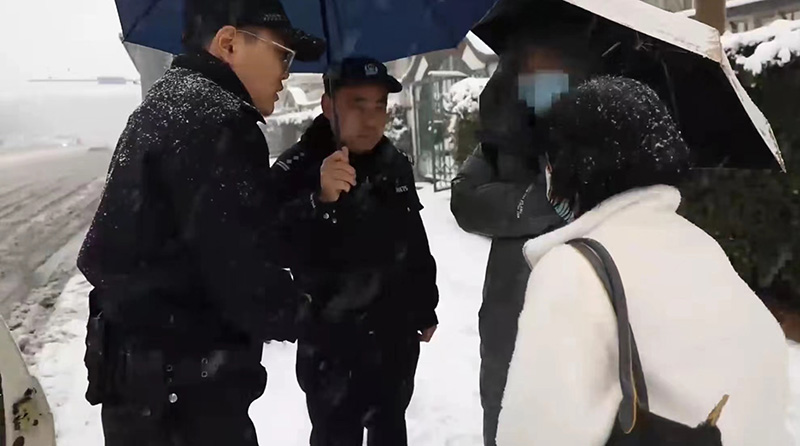圖為濟南市公安局市中區(qū)分局大觀園派出所民警幫助賈女士找回雪中乘錯車的孩子。