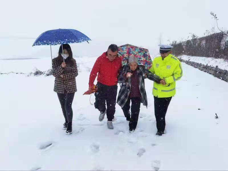 圖為濟南市公安局交警支隊長清大隊歸德中隊民警將遇困車輛上的老人攙扶到中隊。