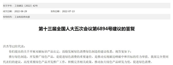 在答復(fù)中,工信部表示,推行綠色制造,開發(fā)推廣綠色產(chǎn)品,是促進(jìn)綠色消費(fèi)的重要途徑,是推動實(shí)現(xiàn)碳達(dá)峰碳中和目標(biāo)的有力舉措。工信部完全贊同代表們的建議,高度重視綠色產(chǎn)品開發(fā)推廣工作,積極完善相關(guān)政策,推動加大綠色產(chǎn)品研發(fā)力度,促進(jìn)綠色消費(fèi)。