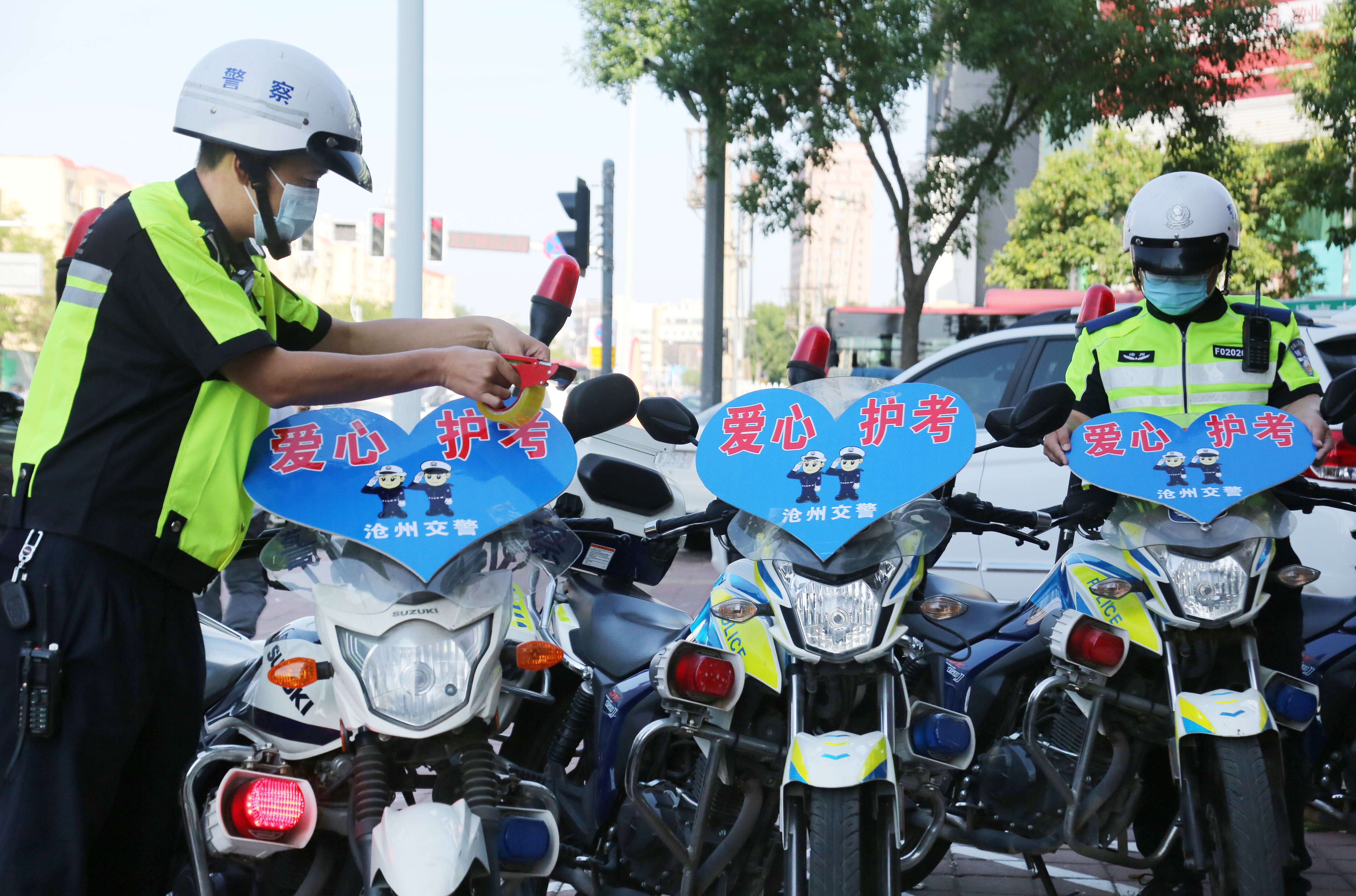 高考在即,河北省滄州市交警提前部署高考護(hù)考管控措施,參加維護(hù)高考交通秩序和護(hù)送考生車輛的執(zhí)勤交警提前進(jìn)入高考狀態(tài),以良好的精神狀態(tài)為高考學(xué)子和接送考生的車輛“護(hù)航”。圖為滄州市公安交警支隊(duì)二大隊(duì)鐵騎交警提前行動(dòng),細(xì)心檢查摩托車機(jī)械運(yùn)行狀況、粘貼“愛(ài)心護(hù)考”標(biāo)識(shí)牌,“備戰(zhàn)”高考。