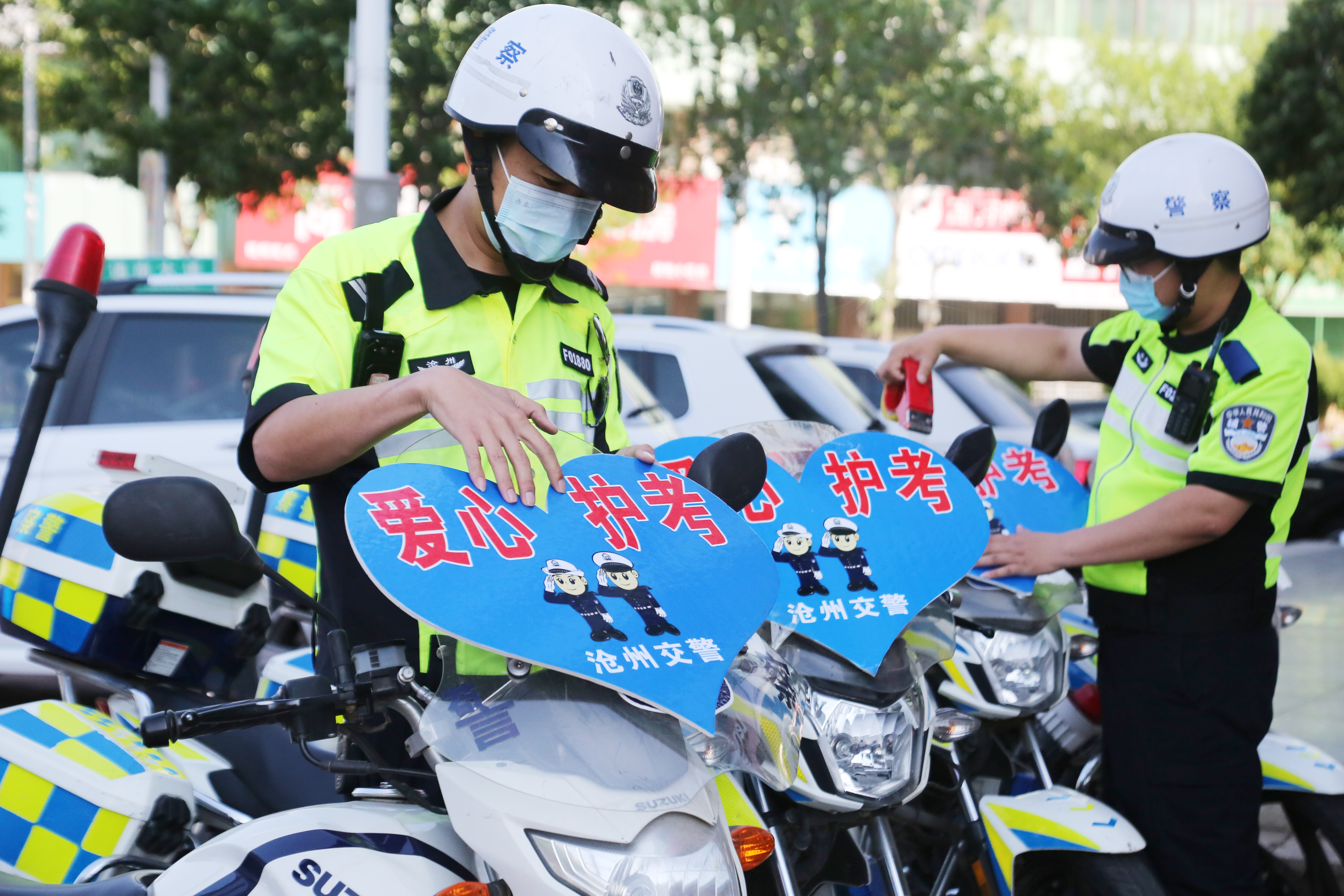 高考在即,河北省滄州市交警提前部署高考護(hù)考管控措施,參加維護(hù)高考交通秩序和護(hù)送考生車輛的執(zhí)勤交警提前進(jìn)入高考狀態(tài),以良好的精神狀態(tài)為高考學(xué)子和接送考生的車輛“護(hù)航”。圖為滄州市公安交警支隊(duì)二大隊(duì)鐵騎交警提前行動(dòng),細(xì)心檢查摩托車機(jī)械運(yùn)行狀況、粘貼“愛心護(hù)考”標(biāo)識(shí)牌,“備戰(zhàn)”高考。