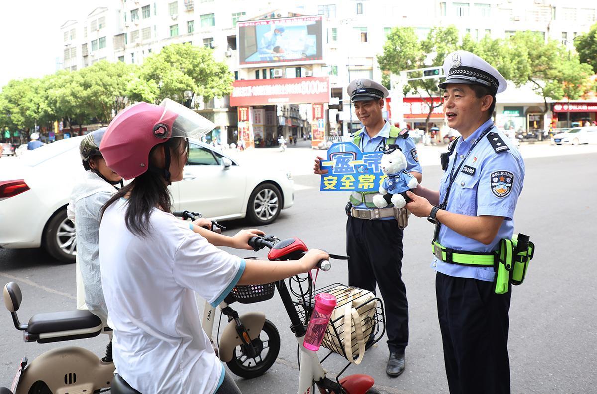 圖為7月10日,民警通過問答互動方式宣傳“三零一戴”,并向群眾贈送“交警小熊”。