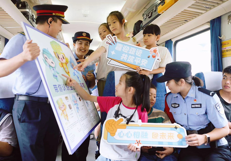 圖為在K466次列車上,乘警和乘務(wù)員向旅客宣傳亞運(yùn)知識。