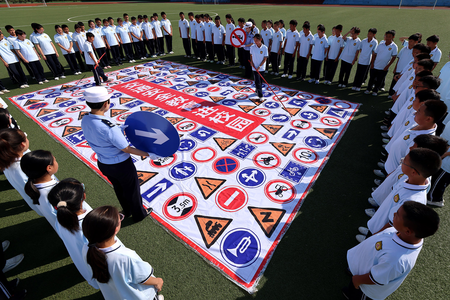 9月14日,在山東省棗莊市第四十一中學(xué),民警和學(xué)生們一起玩“尋找道路交通標(biāo)志”趣味游戲。新學(xué)期伊始,棗莊市公安局市中分局交通警察大隊(duì)組織民警走進(jìn)校園開(kāi)展豐富多彩的安全教育活動(dòng),提升學(xué)生們交通安全法規(guī)意識(shí)和防范意識(shí)。
