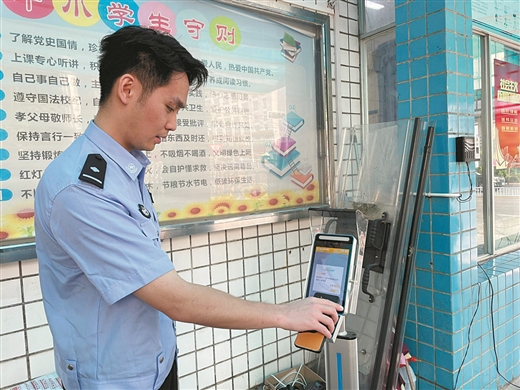 民警展示“碼上回家·預(yù)約小精靈”小程序,用二維碼掃一掃智能機(jī)器即可向家長發(fā)送離校信息。
