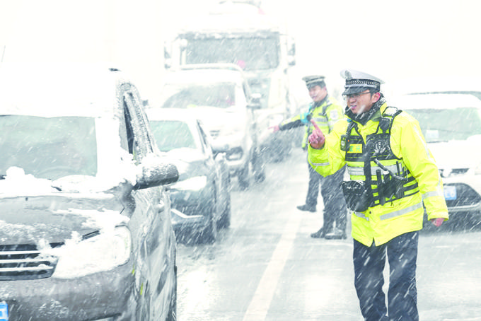 12月18日,受寒潮天氣影響,江蘇省宜興市出現(xiàn)大到暴雪。宜興市公安局交警大隊(duì)立即啟動惡劣天氣道路交管應(yīng)急預(yù)案,組織警力加強(qiáng)巡邏管控和交通指揮引導(dǎo),確保車輛、人員安全。圖為民警在路面疏導(dǎo)交通,提醒駕駛?cè)吮3周嚲?、減速行駛。蔣雨琪攝