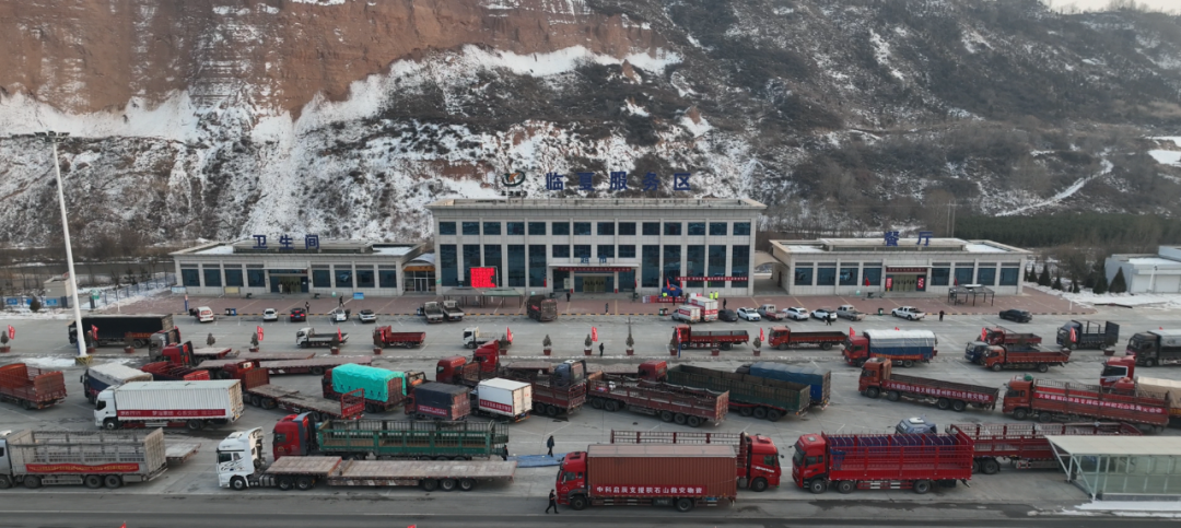 運(yùn)送救災(zāi)物資的貨車車隊(duì)在臨夏服務(wù)區(qū)休整
