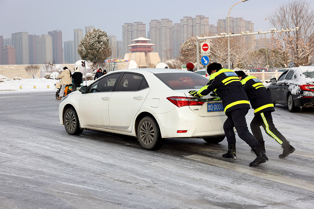 2月5日,山東省棗莊市公安局市中分局交通警察大隊民警在道路上幫助推行雪中打滑被困的車輛。近日,受冷空氣影響,棗莊市出現(xiàn)雨雪冰凍天氣過程。棗莊市公安局市中分局交通警察大隊啟動惡劣天氣應(yīng)急管理預(yù)案,全員上崗,保障市民出行平安。