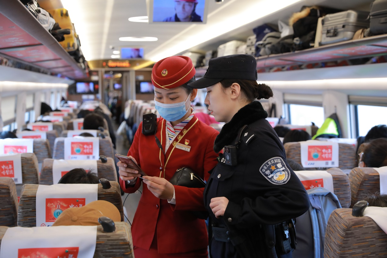 今年,北京鐵路公安處乘警支隊(duì)女子乘警隊(duì)首次參加春運(yùn)值乘任務(wù),主要值乘管內(nèi)京滬線上的部分高鐵列車。她們堅(jiān)守工作崗位落實(shí)各項(xiàng)安保任務(wù),并向旅客發(fā)放反詐宣傳冊、宣講反詐常識(shí)等。圖為G9高鐵上,乘警紀(jì)明月與當(dāng)次列車長一起進(jìn)行車內(nèi)巡檢。 本報(bào)記者 常鑫 本報(bào)見習(xí)記者 韓毅 邢國涵 攝