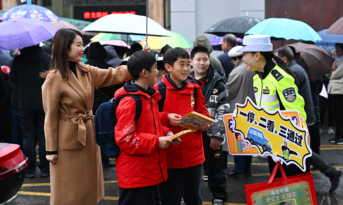 2月20日,江蘇省中小學(xué)開學(xué)報(bào)到第一天,恰逢春雨滿江南,江蘇省宜興市公安局交警大隊(duì)組織警力,采取錯(cuò)峰出行,單向行車等措施,確保入學(xué)時(shí)段車輛人員安全。
