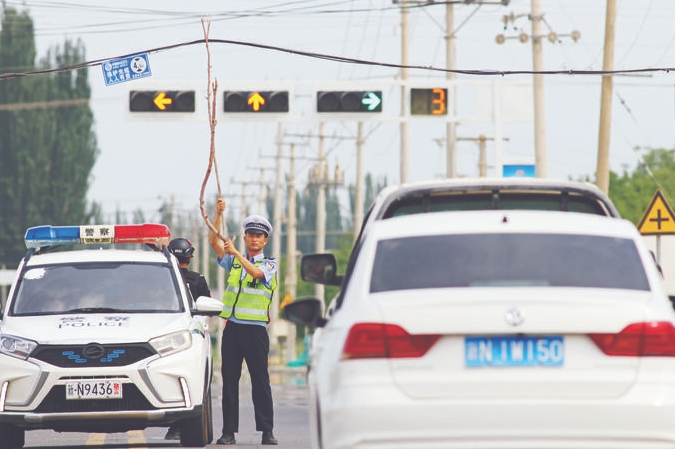 圖為民警冒著高溫,用斷落樹(shù)枝頂起光纜,以保證車輛順暢通行。胡國(guó)華攝